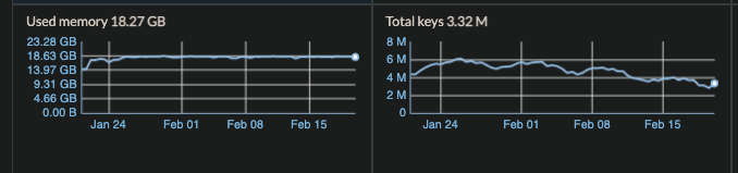 grow indefinitely, never expire, and eat away at keyspace until a flush is needed.The graphs below show the past month where memory usage has remained the same, but the keys that can fit into memory continue to decline, because these "sets" within them continue to grow