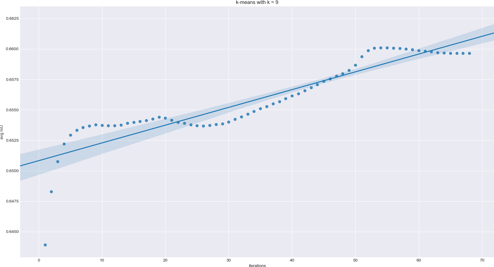As the plots show the algorithm converges to lower values than expected. To resolve this problem, I changed k-means to not run until convergence. Whenever the values started to drop, the algorithm would start again with different initial means. By doing this for about 50 iterations, an average IoU of about 60 was possible.