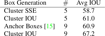 According to the paper we should get 61.0 avg IoU with 5 clusters and 67.2 avg IoU with 9 clusters on the VOC 2007 data set: