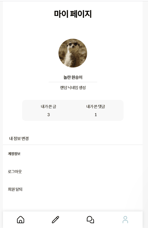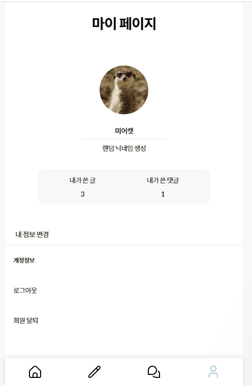 마이 페이지 탭에서 내가 쓴 글과 댓글을 모아서 조회할 수 있습니다. 홈 탭과 마찬가지로 게시글을 수정하거나 삭제할 수 있습니다.
