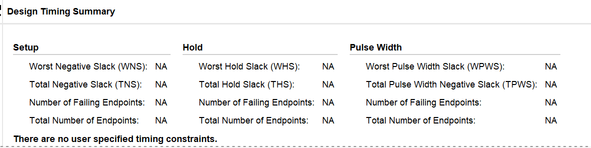 此后,我们观察一下Timing Summary提供的时序报告,可以看到,在绑定了相应的管脚的前提下,在时序报告里,包括WNS、WHS、TNS等在内的所有时序指标均未出现延时冲突,满足设计要求。可以进行上板验证。