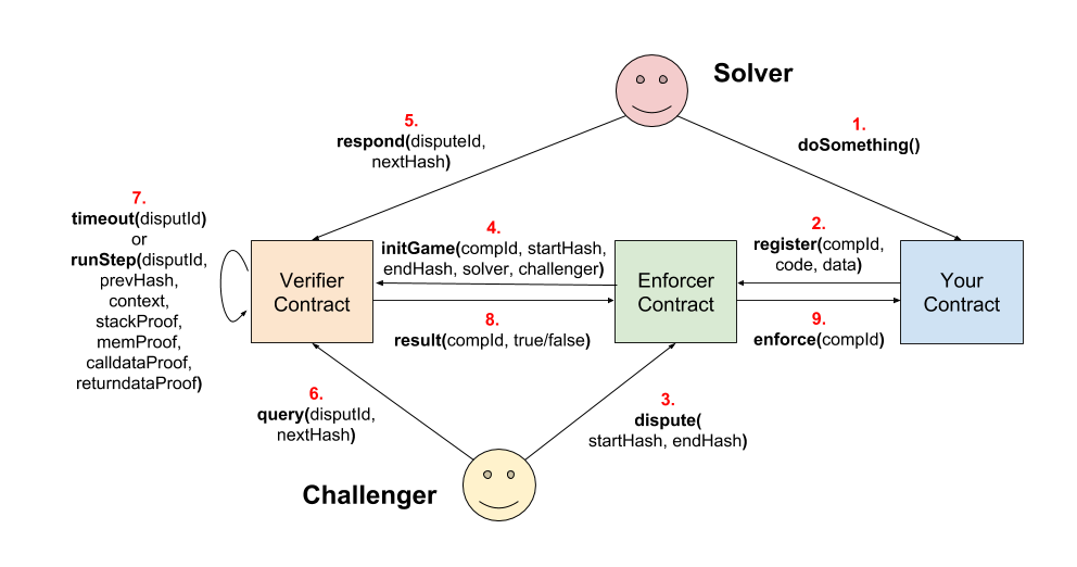 Anyone who solved some off-chain execution can register a result with the Enforcer contract. A challenge period starts during which challengers can open disputes over the presented results. Disputes are delegated to the Verifier contract where solver and challenger play an interactive execution verification game. If the challenger wins, the execution results are deleted and the solver looses a bond. If the solver is able to defend the execution results throughout the challenge period, the result is accepted.