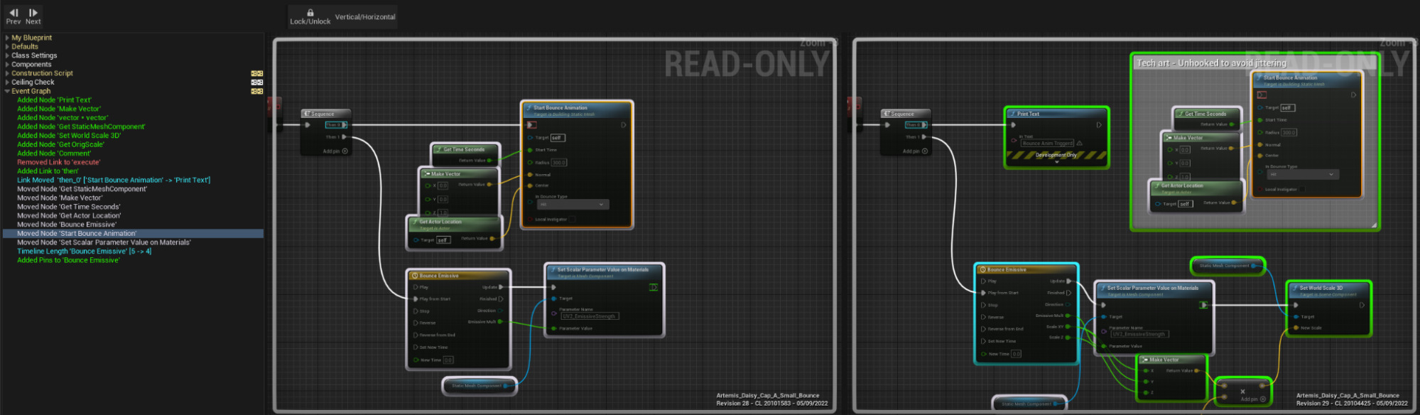 In perforce, simply open the history tab on an .uasset file, select a revision and right click to use the “Diff against previous revision”.