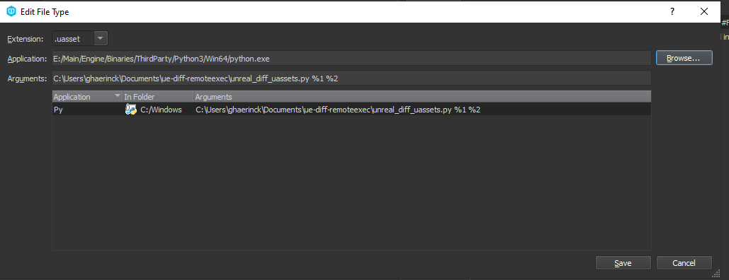 It will open a window where you will specific the diff behavior. Unreal Engine is embedding python so simply need to point to it to be able to execute scripts. You will also need to copy the path to where you extracted the script folder as you will need it as argument.