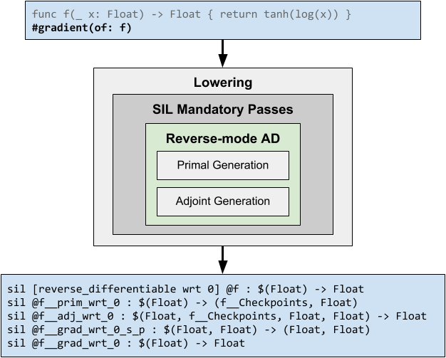 Two recent projects (Tangent and Myia) based their AD upon source code transformation (SCT), a technique that was common in advanced AD systems before the deep learning era such as Stalin∇. Both tools parse a Python subset into ASTs and transform a function to its derivatives either in AST or in a functional IR. These two projects fall into a category in deep learning tools that was previously underexplored: ahead-of-time differentiation + "model as code", as shown in the following diagram (cite: Tangent). While these tools are pushing the boundaries of Python, other research projects like DLVM experimented with SCT AD directly on a compiler IR that's analogous to the Swift Intermediate Language (SIL).