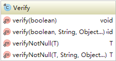 跟PreConditions差不多,只不过只能检查表达式是否为true,false的时候PreConditions抛出jdk定义的异常,而Verify抛出guava自己的VerifyException -