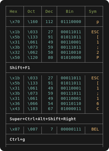By default, keypress runs in interactive mode. In this mode, it generates a byte-by-byte representation of keyboard inputs as the user types, whether for individual keys or key combinations. This representation includes the following formats: hexadecimal, octal, decimal, binary, and the corresponding symbols.
