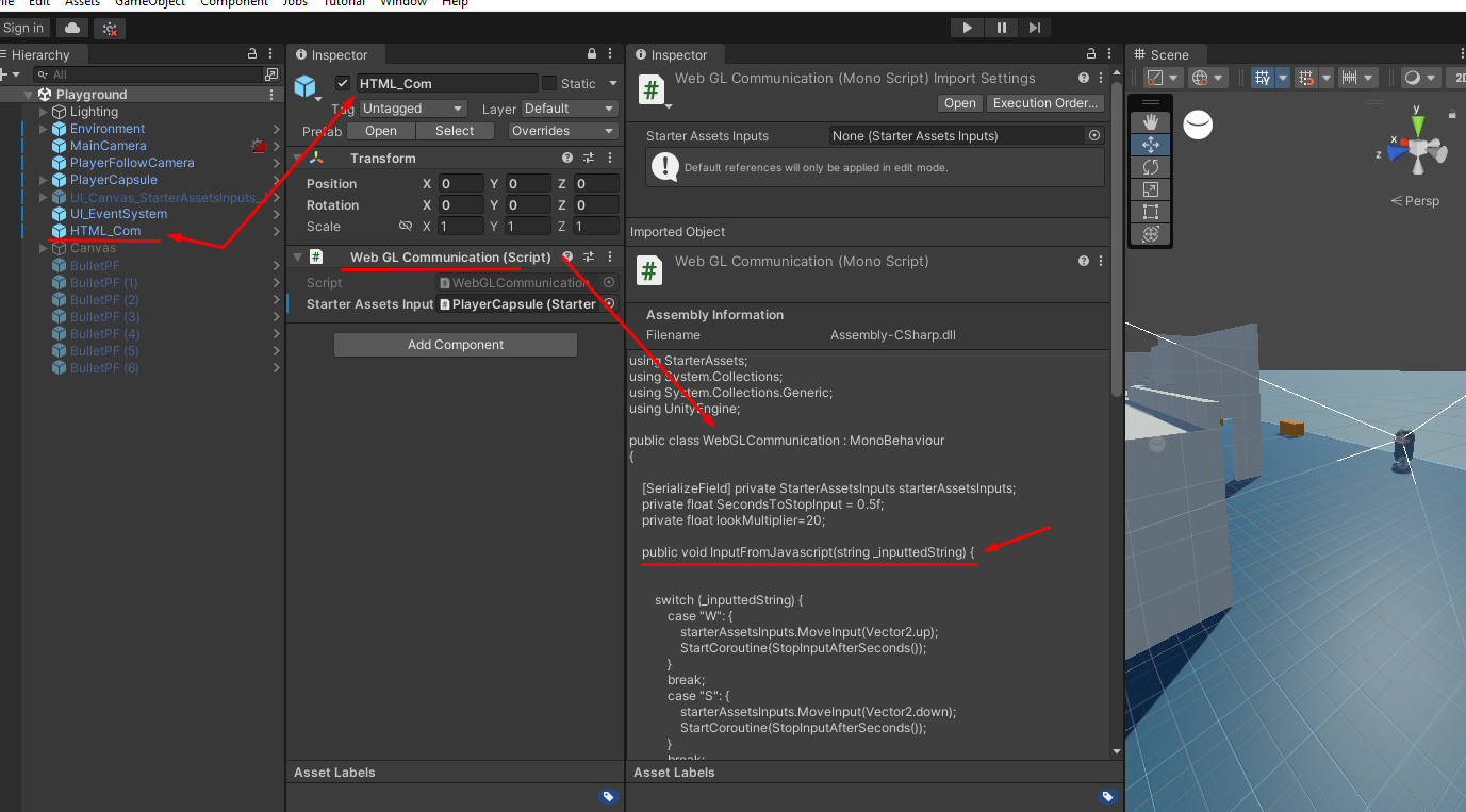 public void InputFromJavascript(string _inputtedString) { ... }For the environment I used the Starter asset Oficial from Unity: