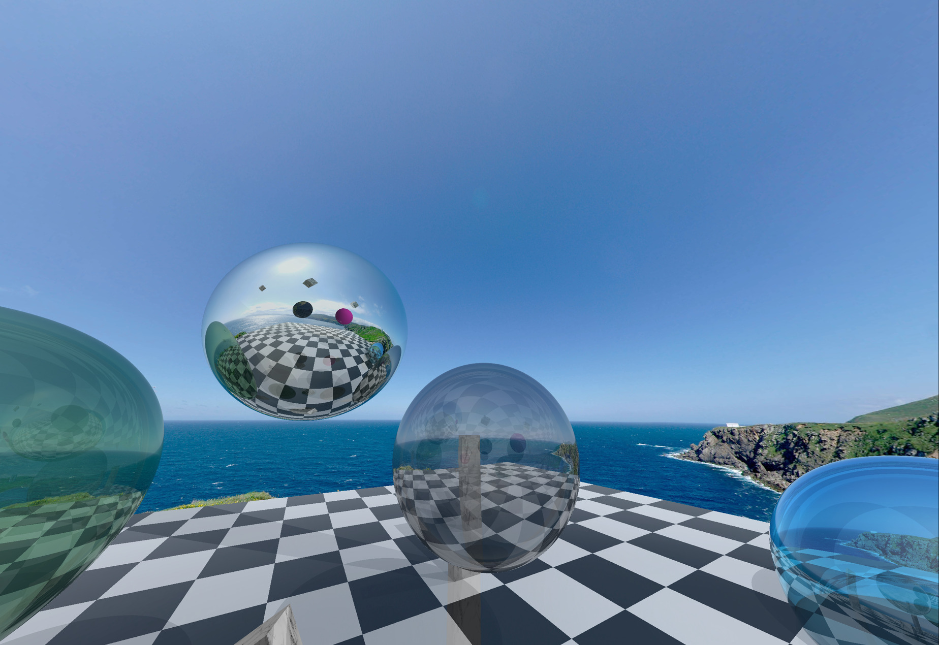 Challenging scene with objects floating above a plane, overlap between an object and the plane, various materials, reflectivities and transparencies. Textures can be toggled. | ✓ |