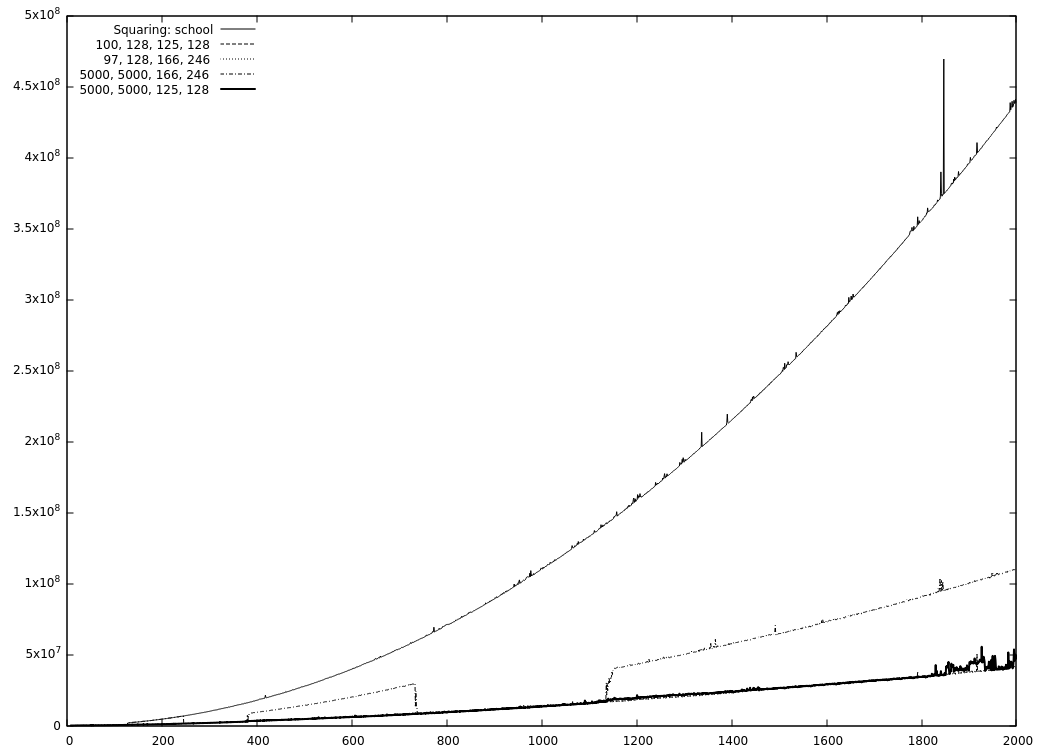 So it's slower now, if I understand your graphic correctly and it's not even a small difference? But I still made no absolute timings with the benchmark in The problem is that the Comba multiplication has an upper limit, all of the faster ones have lower limits (besides FFT which has both, but that's not in here). There is also a steep jump at Comba's upper limit. That together with the cascading down of the T-C algorithms makes the behaviour a bit chaotic overall.