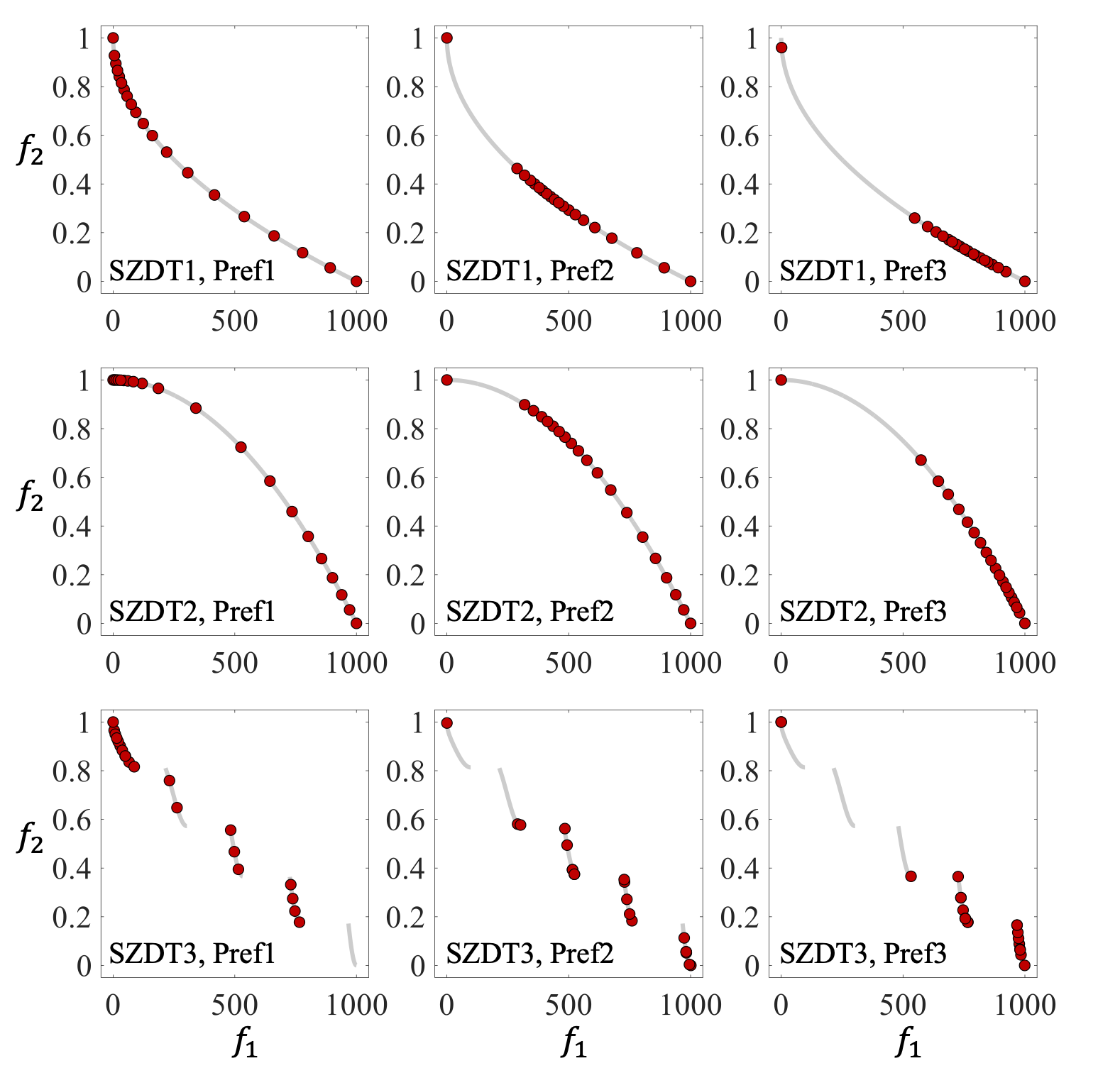 Solutions obtained by SPEA2-PN on SZDT1-3 with different preferences: