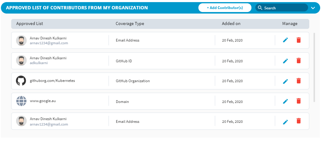 Approved List of Contributors From My Organization will show the CLAs signed by user's company. The table displays following columns: