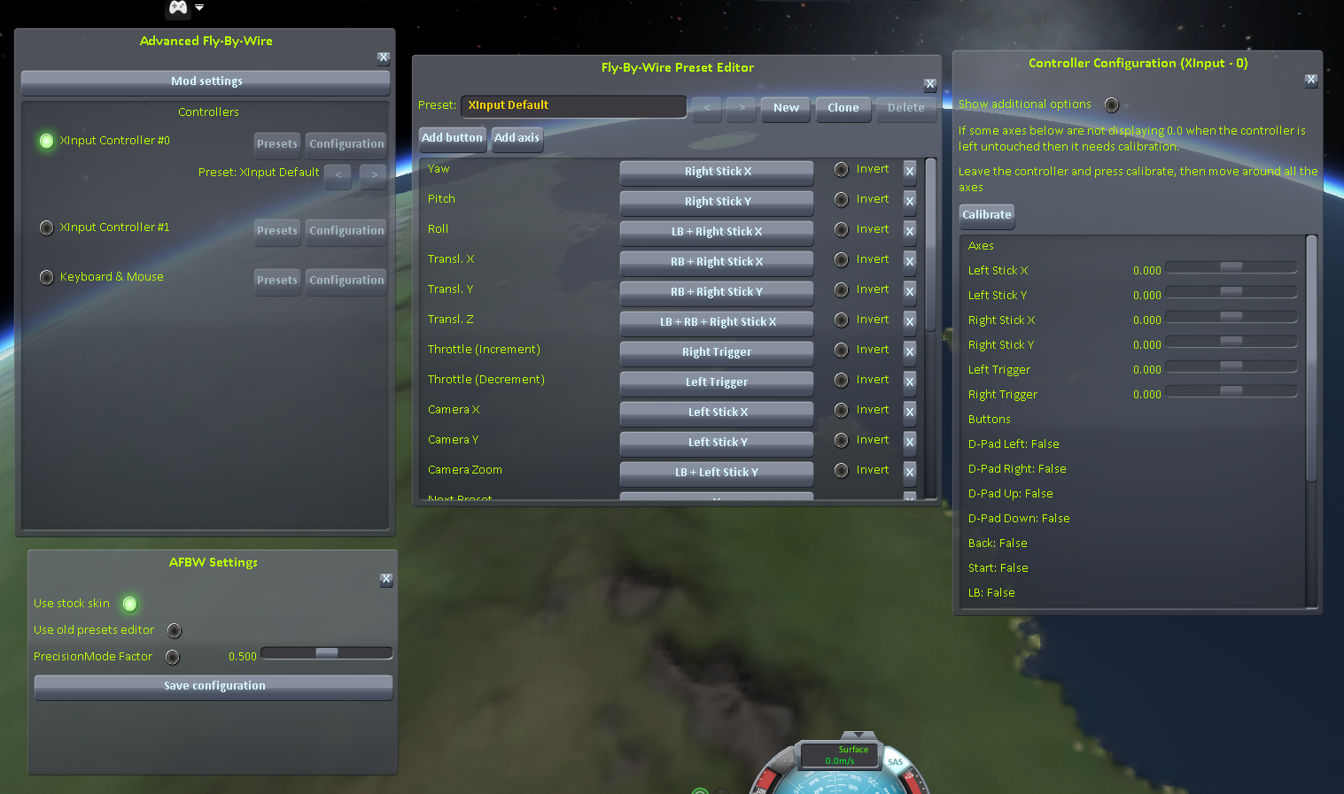"Presets" will open up the preset editor which is very similar to KSP's stock bindings editor. Using the preset editor you can modify your controller layout at any time.