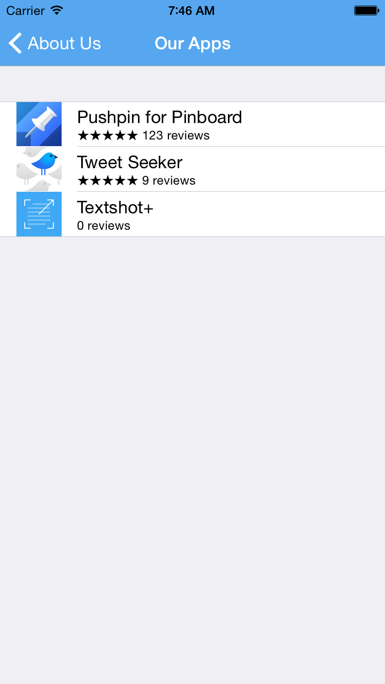 This is an easy way for you to show your users the other apps that you have developed. Here's what it looks like in one of our apps, Tweet Seeker.