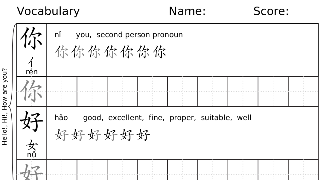 gen.py --makemeahanzi=$MAKEMEAHANZI_PATH --cedict=$CEDICT_PATH --characters='你好' --title='Vocabulary' --guide='star' --stroke-order-color='red'