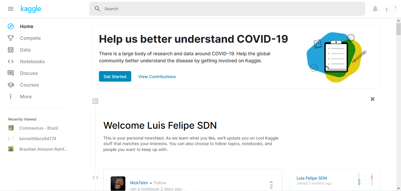 Os dados estão sendo obtidos em sua maioria por meio de um site chamado Kaggle, ele é uma espécie de rede social de Data Scientists, onde são compartilhados inúmeros datasets, notebooks, e até mesmo competições, onde varias pessoas se reúnem a partir de dados e artigos para construir análises e construir conhecimento.