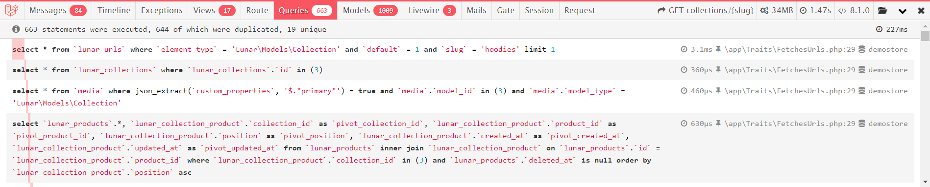 README.md. The only thing I did was add the Laravel Debugbar to it to verify and view the queries being executed.When viewing a collection page these are the queries that are being executed with all the default seeding: