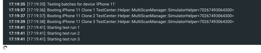 Hi, @lyndsey-ferguson I have a question: How can we print test execution in Jenkins console log while we run for ex. on 3 parallel simulators? For now, if I will run tests on 3 parallel simulators I can't see any info about how tests are going, I see info only at the end and I can't see any info in the console during execution, it looks like this: And If I will run on 1 simulator I can see info about each test execution in console: |
