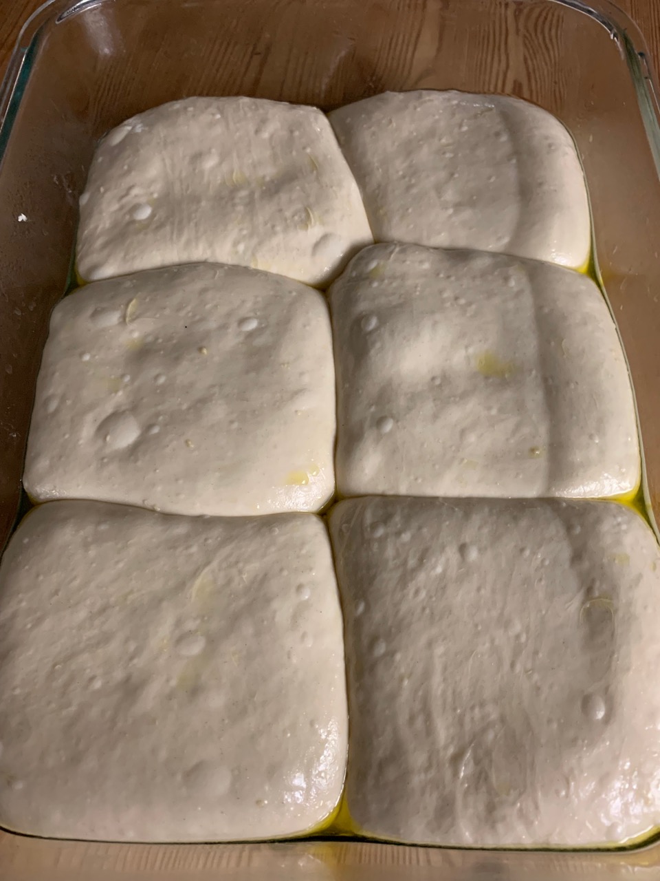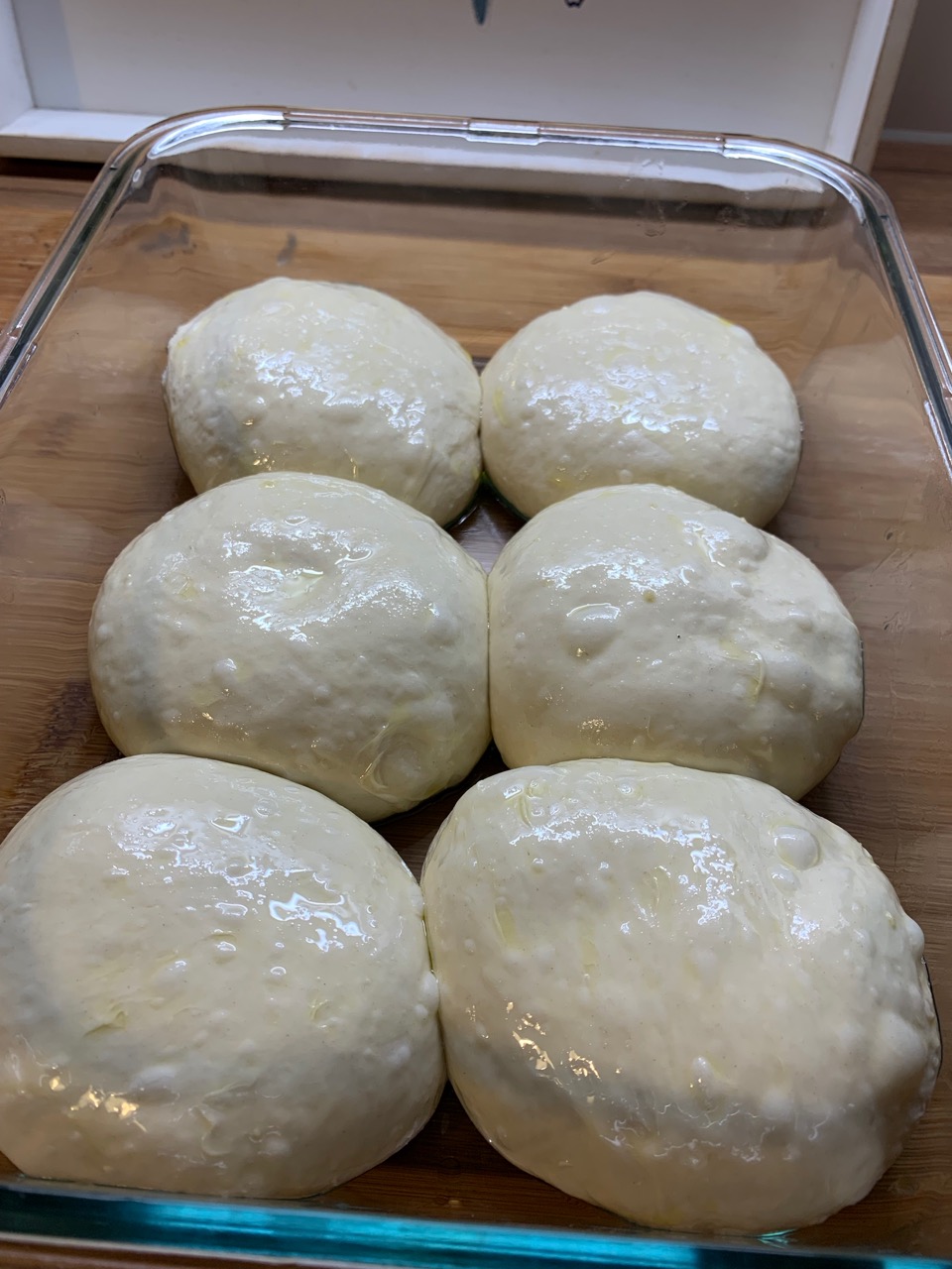 Place the created balls in an oiled container. Make sure to oil the top of the balls as well. We are doing that to prevent them from leaking moisture. At the same time it will make them stick less to each other we remove them from the container again later. Below is a picture of how my dough balls look in the final container. Note how they already slightly stick to each other. Also note the beautiful pockets of air already visibly present on the dough. If you managed to pull this off - good job. That's already 80% of the work required to make excellent pizza dough.