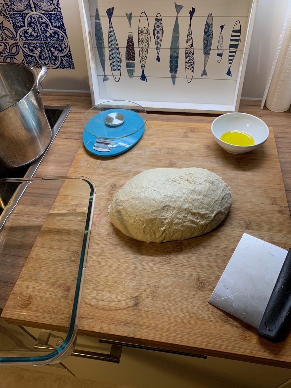 What you need for the next step is your scale again, a dough scraper (a knife will do), a sealable container (could also be a pot) plus some oil (I use olive oil).