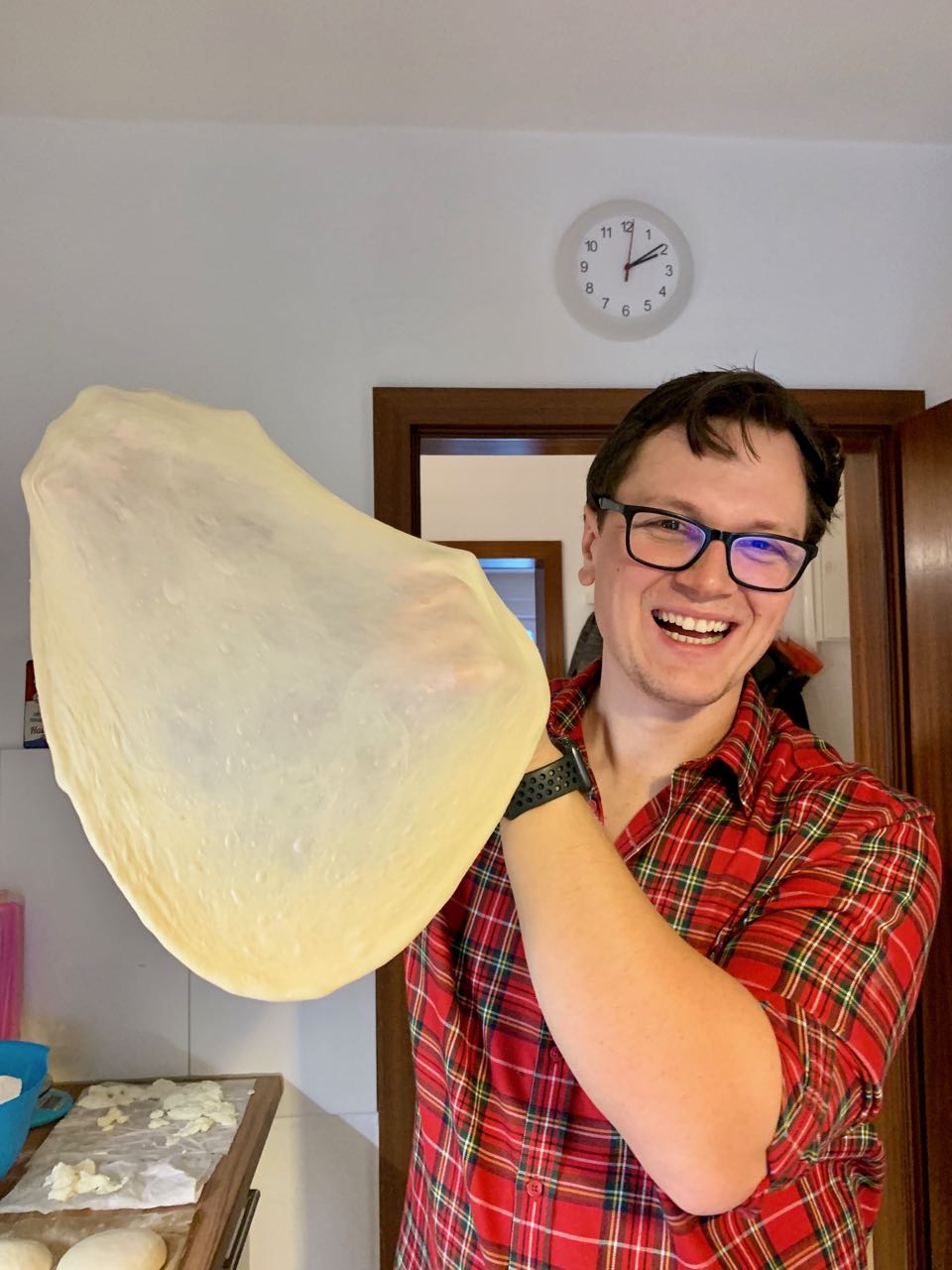 Lift the pizza into the air at one edge. The dough should start spreading. The center should become more and more transparent of your dough. You can see me doing this at the first picture in the guide. Turn the pizza to allow the dough to evenly stretch. If some of the areas are still too thick, stretch that area with your hand by pulling the dough apart. The inner part of the pizza should be around 1 to max 2mm in size. See the first picture again.