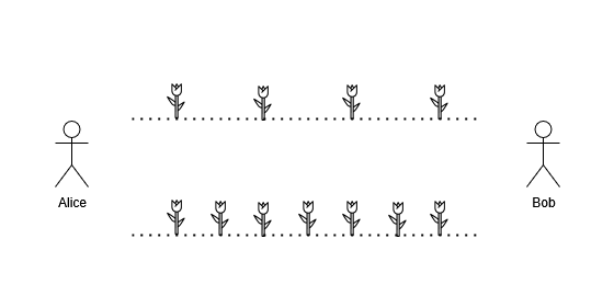 Topics: Alice and Bob are playing a turn-based game on a field, with two lanes of flowers between them. There are