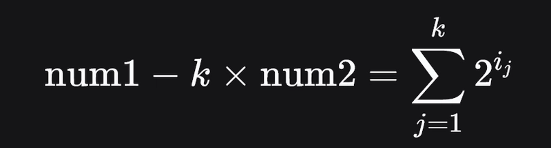 powers of two. For the equation to hold, the value S = num1 - k x num2 must be non-negative and at leastk