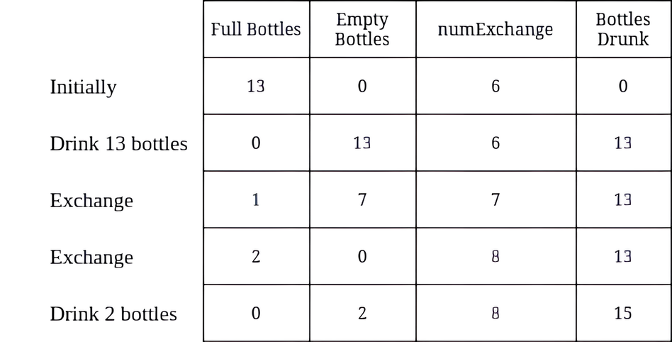Final result: 15 bottles drunk The algorithm efficiently simulates this optimal strategy by always drinking all available bottles first, then exchanging as much as possible, repeating until no more exchanges can be made. Time Complexity: O(n) where n is the number of bottles |