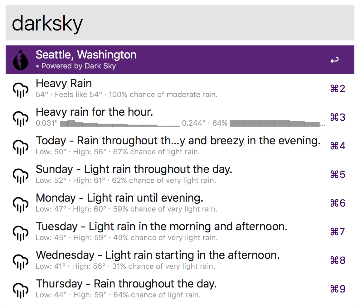 DARK_SKY_API_KEY: Get an API key here.GOOGLE_API_KEY: Get an API key here. (Used for geocoding queries. This can be omitted if you only want the forecast for the current location.)FORECAST_UNITS: Defaults toauto, which sets the units based on the location. Usesifor Celsius andusfor Fahrenheit.DEFAULT_LAT_LONG: Set this to override IP geolocation. Ex:47.7396,-122.3426for Seattle.DEFAULT_LOCATION: Used for displaying the location name when usingDEFAULT_LAT_LONG.