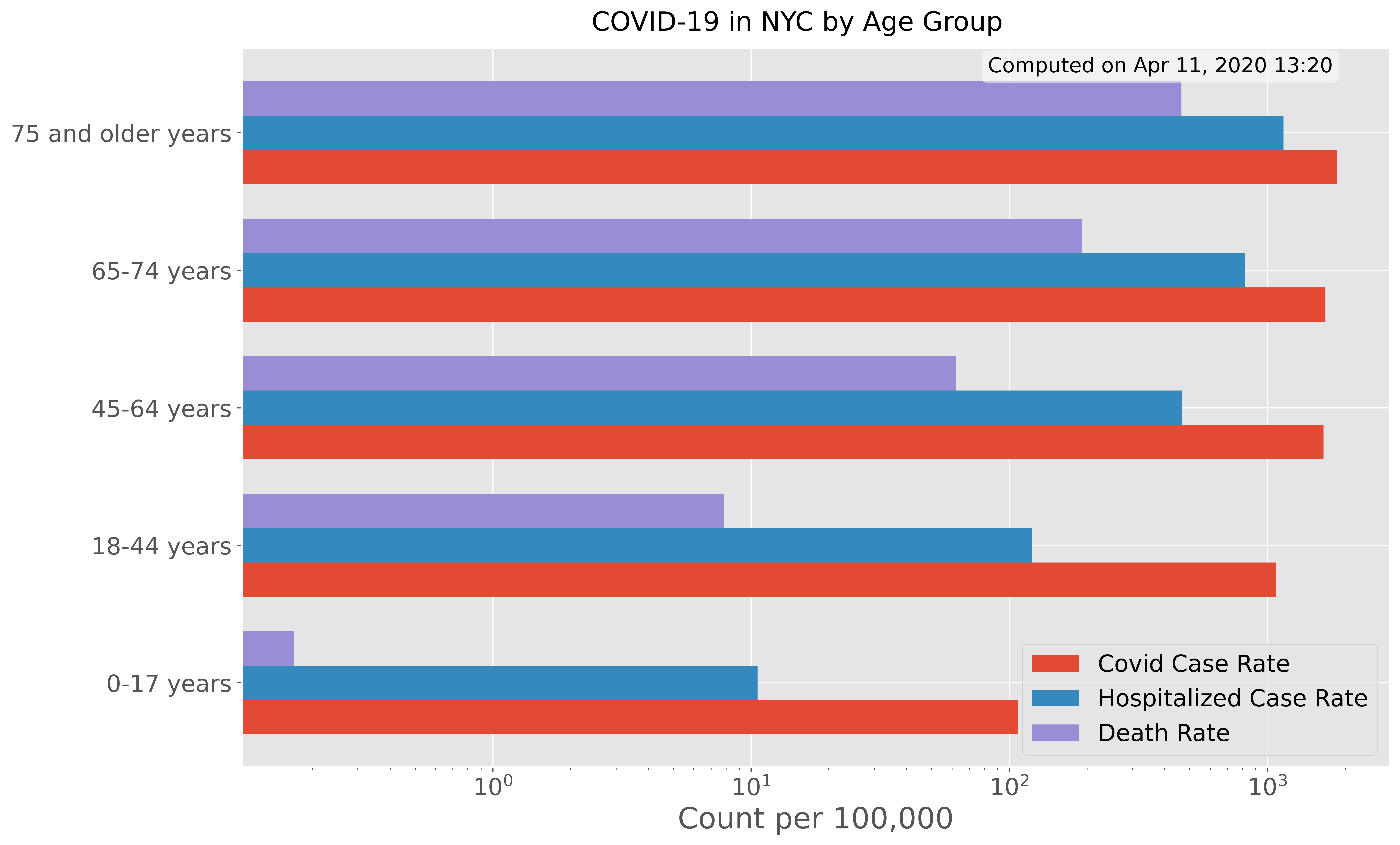 Using Python to visualize various datasets relating to COVID-19 in New York City. Analyses include: plotting rates by age and sex, geographic maps by zip code, and time-series plots with logarithmic axes.