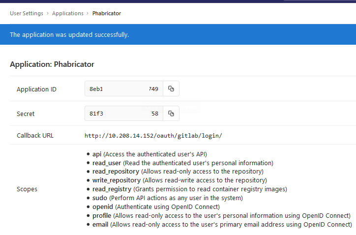 - Downloaded https://github.com/manGoweb/phabricator-gitlab-auth-provider/blob/master/src/oauth/PhabricatorGitlabAuthProvider.php and https://github.com/manGoweb/phabricator-gitlab-auth-provider/blob/master/src/oauth/PhutilGitlabAuthAdapter.php. Replaced all occurance of mangoweb.org to gitlab.com.