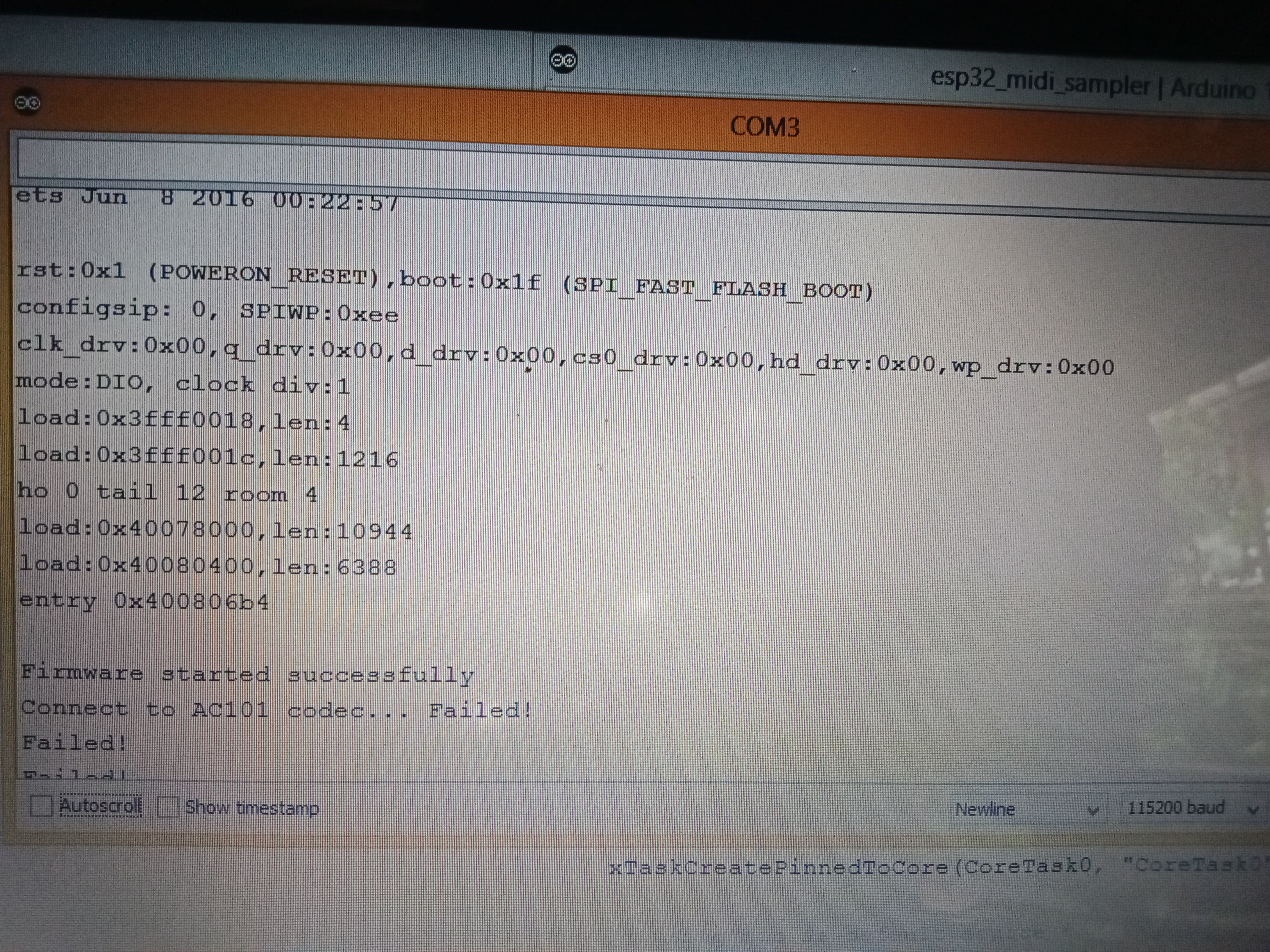 The 'esp32 _midi_sampler' program was successfully uploaded to ESP32 audio-kit. But when I open the serial monitor it shows "Connect to AC101 codec Failed!".