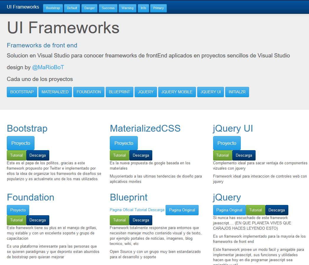 Este proyecto tiene como finalidad estudiar los diferentes frameworks de presentacion y aplicarlos a un proyecto ASP.NET MVC, la finalidad es conocer como se referencian y se llaman los componentes necesarios para integrar los frameworks de presentacion con un proyecto ASP.Net MVC.