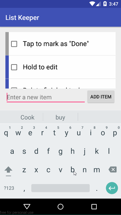 List Keeper is an android app that allows building a todo list and basic todo items management functionality including adding new items, editing and deleting an existing item.
