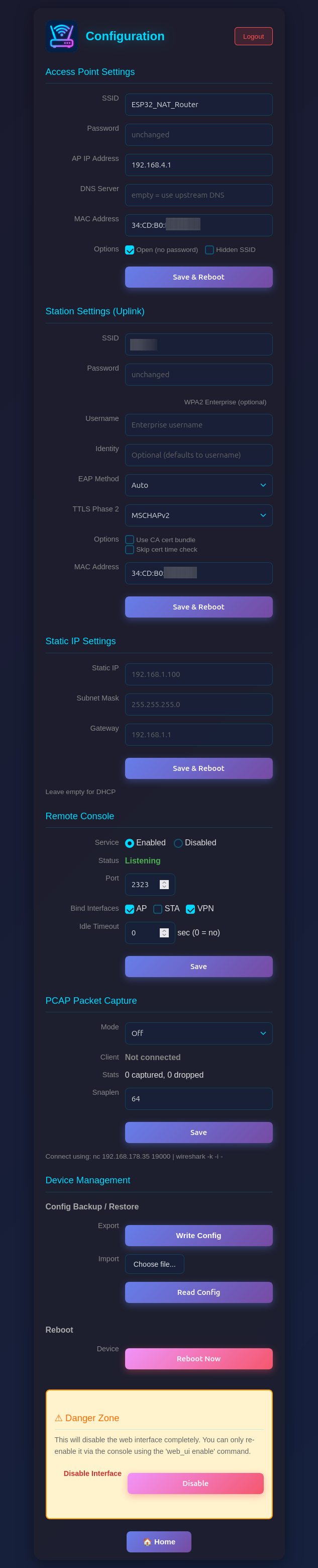 The web interface allows for the configuration of all parameters. Connect your PC or smartphone to the WiFi SSID "ESP32_NAT_Router" and point your browser to "http://192.168.4.1" (or later the configured AP IP address).