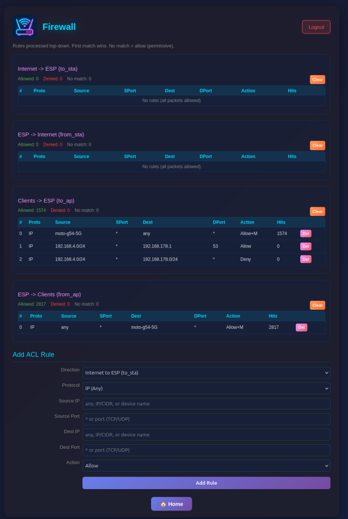 - Four ACL Lists: Control traffic in each direction (to_sta, from_sta, to_ap, from_ap)