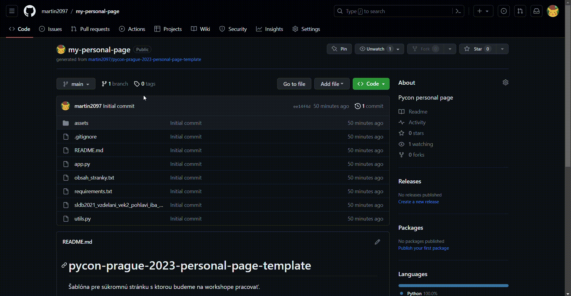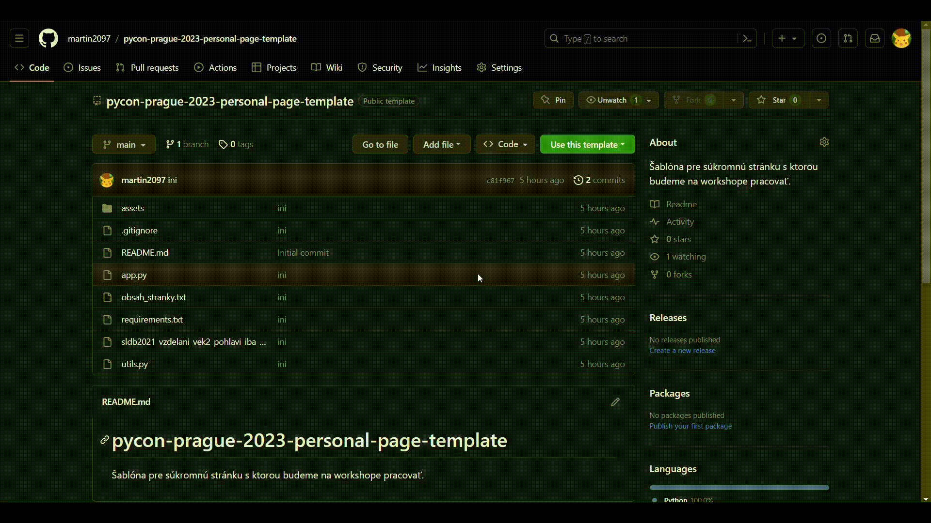Tento template repozitár slúži ako štartovací bod pre workshop "Interaktivní (nejen) datové aplikace s Plotly Dash" na pražskom PyCone 2023. Výsledok ku ktorému sa pokúsime smerovať bude vyzerať takto: https://pycon-prague-2023-personal-page.onrender.com/