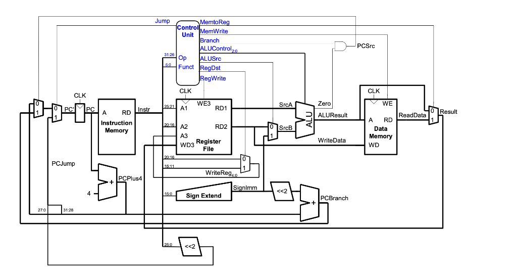 The architecture was heavily inspired in the 32-bits Single Cycle MIPS processor explained in Digital Design and Computer Architecture book. Note that instruction and data are stored in separate memories.