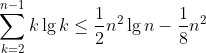 + \sum_{k=n/2 + 1}^{n}k\lg{n} \\ ~ \hspace{22 mm} = \lg(n/2)\sum_{k=2}^{n/2}k + \lg{n}\sum_{k=n/2 + 1}^{n}k \\ ~ \hspace{22 mm} = (\lg{n} - \lg{2})\bigg(\frac{(n/2)(n/2 + 1)}{2}\bigg) + \lg{n}\bigg(\frac{n(n+1)}{2} - \frac{(n/2)(n/2 + 1)}{2}\bigg) \\ ~ \hspace{22 mm} = \lg{n}\frac{n(n+1)}{2} - \frac{(n/2)(n/2 + 1)}{2} \\ ~ \hspace{22 mm} = \frac{1}{2}\lg{n}(n^2 + 2n + 1) - \frac{1}{8}(n^2 + 2n + 1/8) \\ ~ \hspace{22 mm} = \frac{1}{2}n^2\lg{n} - \frac{1}{8}n^2 - \frac{8n\lg{n} + 4\lg{n} - 2n - 1/8}{8} \\ ~ \hspace{22 mm} \le \frac{1}{2}n^2\lg{n} - \frac{1}{8}n^2)