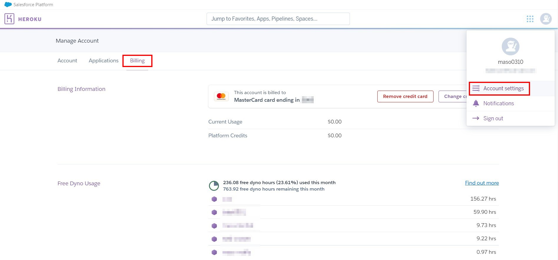 4.若要維持每天24小時運作,則需要進入heroku官網進行信用卡資料設定(從每月550小時額度新增為1000小時),同一個帳號之下的APP使用的運作時間共同計算,可由信用卡設定下方觀看每月額度與已使用累積時間。