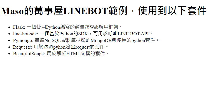 <h1>Maso的萬事屋LINEBOT範例,使用到以下套件</h1>