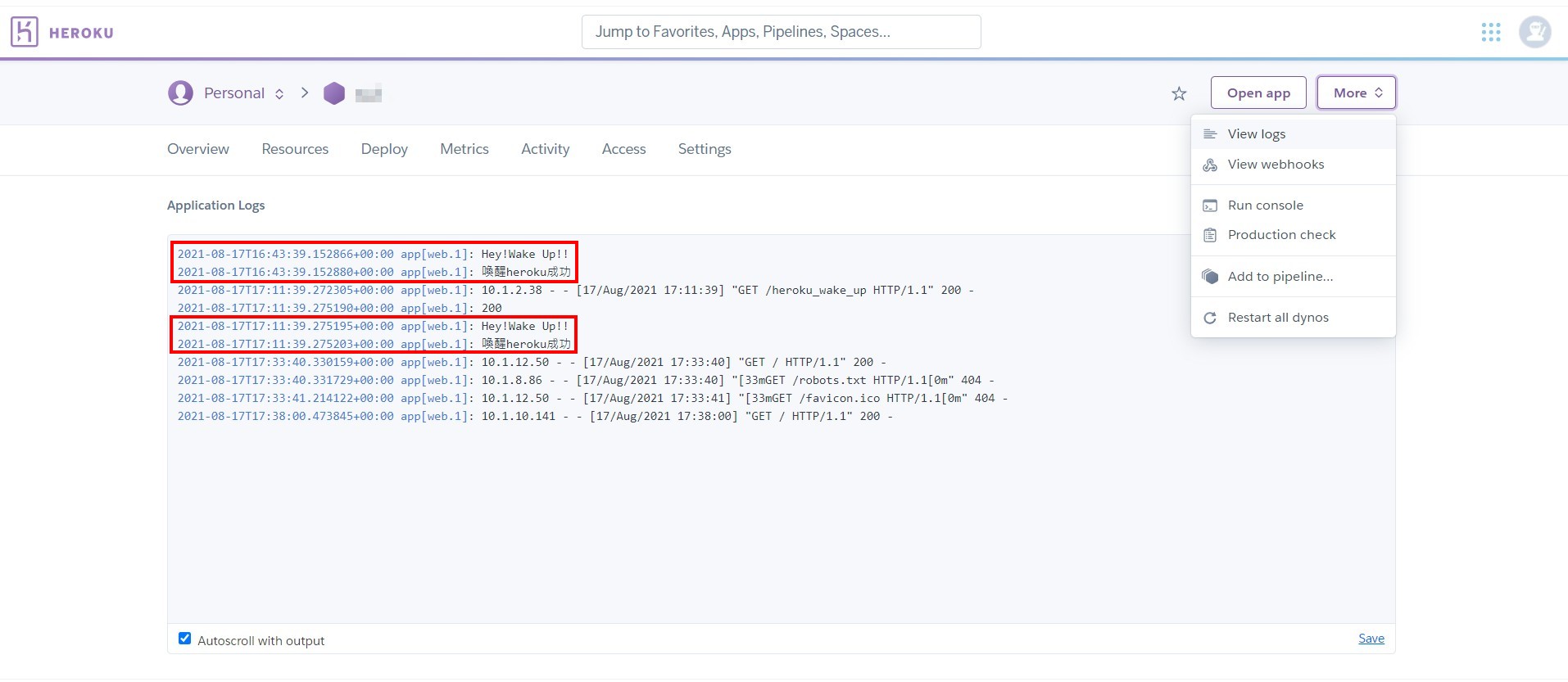 6.在herokuapp的more當中,可由viewlog看到每28分鐘進行一次喚醒的動作,代表完成設定