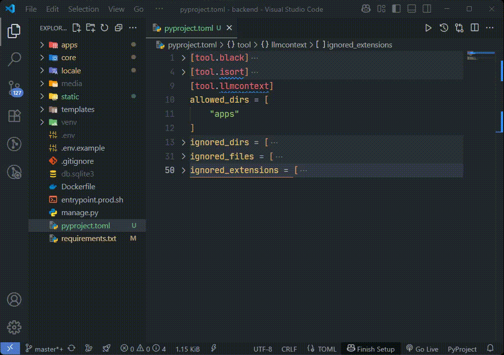 llmcontext . -o my-api-context.mdFor precise control, you can add a dedicated section to your project's pyproject.toml file. The tool will automatically find and use it. This is the recommended way to handle