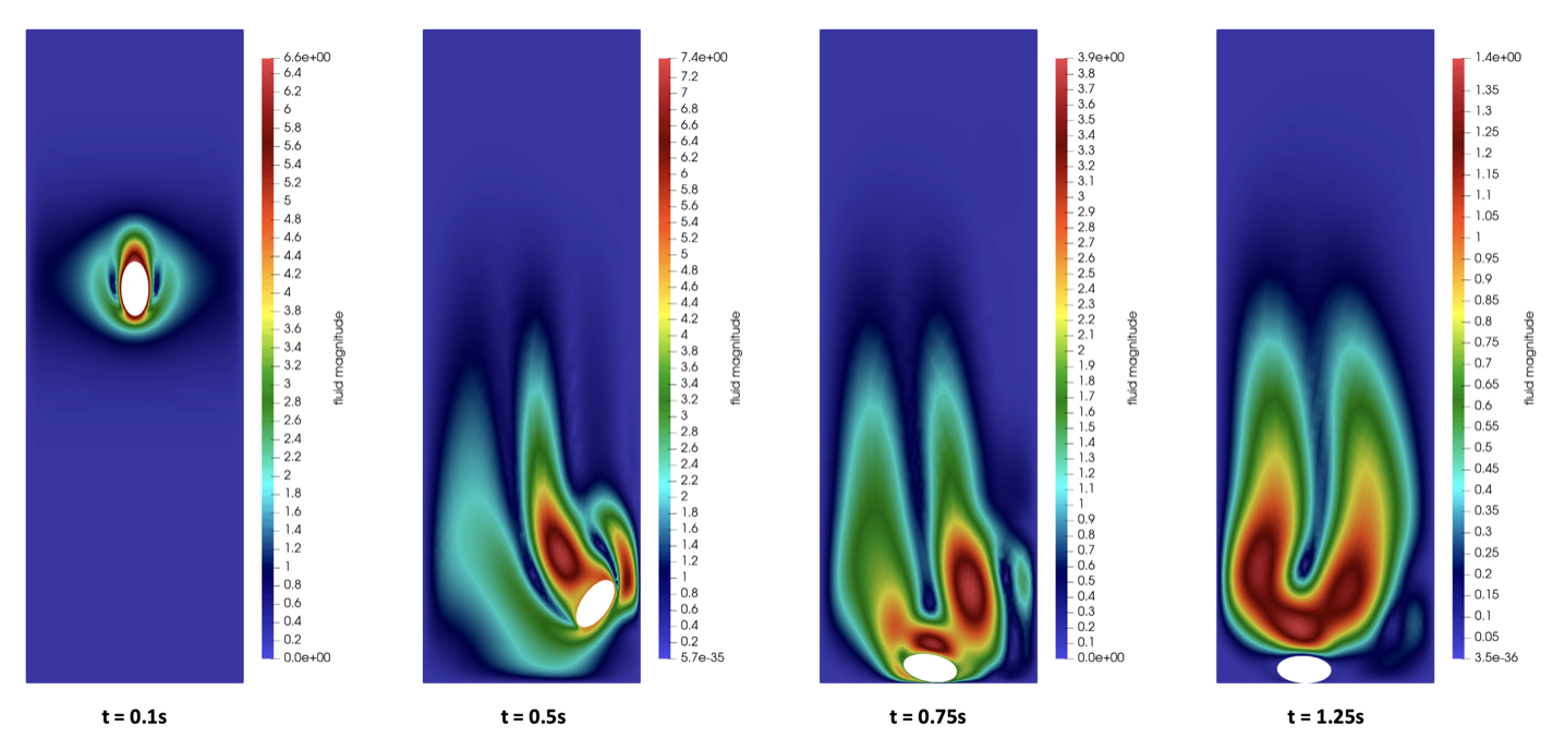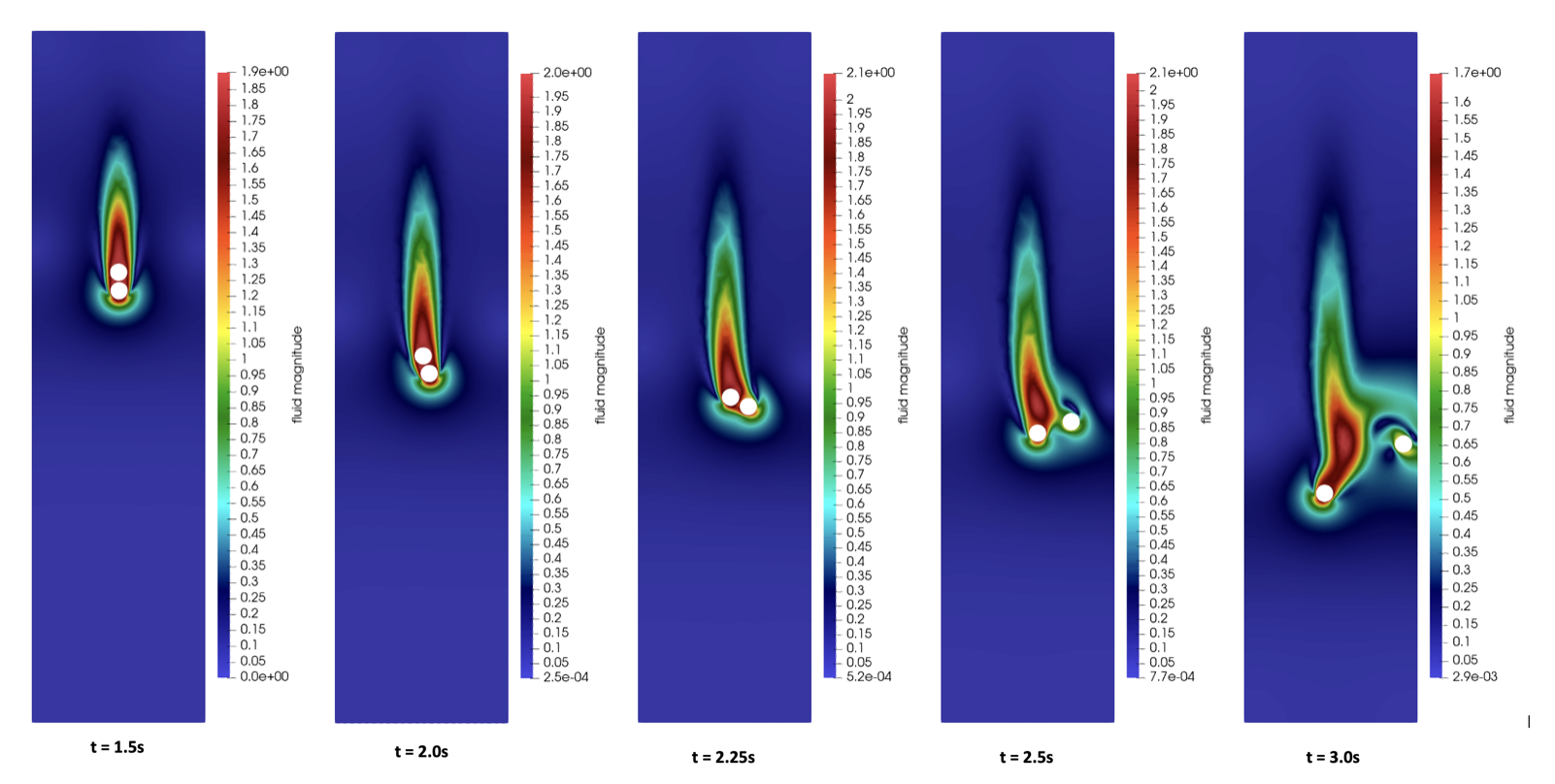 This simulation represents a phenomenon called drafting, kissing and tumbling : the lower body creates a pressure drop reducing the fluid resistance for the upper body. Therefore, the upper body falls faster until it collides with the lower one, leading to a rotation of the two bodies. Finally, the repulsive forces cause the separation of the two bodies.