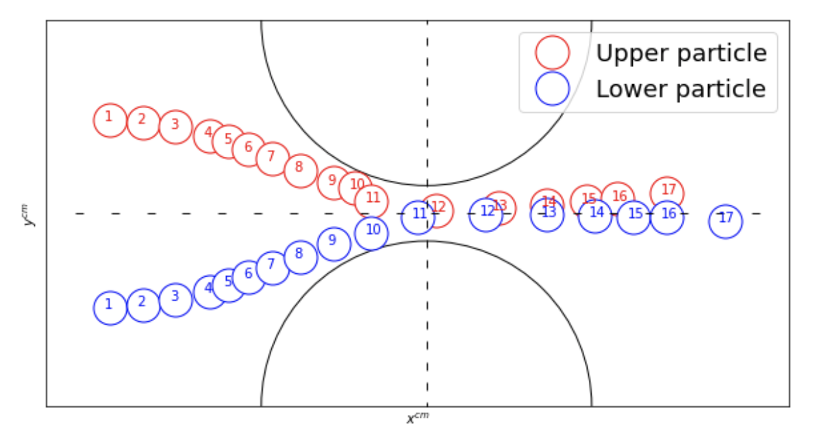 Two particles are located asymmetrically to the horizontal centerline in an artery. They move under the effect of hydrodynamic forces caused by a pressure difference between the inlet and the outlet. The two particles pass the stenotic throat due to this slight asymmetry. The particles move side by side, represented by the snapshot 1 − 9, until they are near the stenotic throat, snapshot 10. This latter indicates that the upper particle stops and moves back to allow the lower particle, that keeps moving, to pass the throat. Once passed, the upper particle changes direction and follows the first particle through the artery, shown by snapshot 11 − 17.