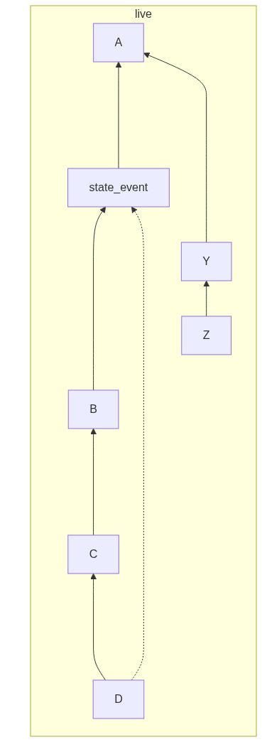 Based on the DAG below, as a remote federating server, my assumption is that we process event D which fetches the state_event as an outlier. Then as we backfill more, and process state_event directly, it becomes an ex_outlier.