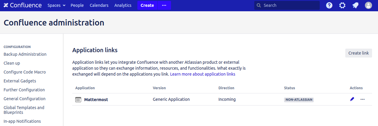 Create a new application link in your Confluence server by going to Settings > Applications > Application Links