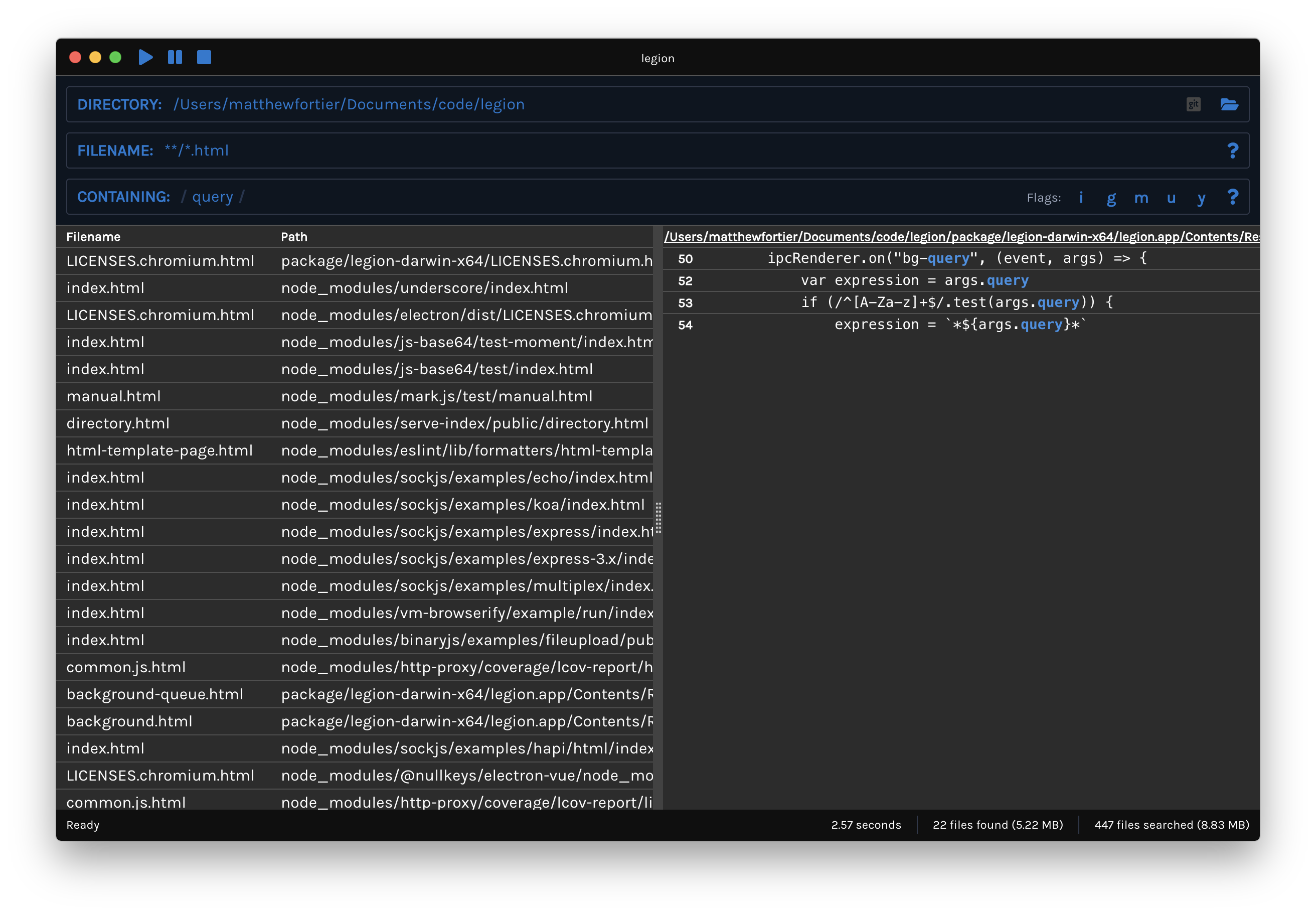 Legion is a cross-platform file searching utility designed with the developer in mind. Daunting codebases with hundreds of thousands of lines of code instantly made more manageable. Use of glob patterns for file searching and regex for containing text will be familiar to savvy developers and help them find the files and code they need.
