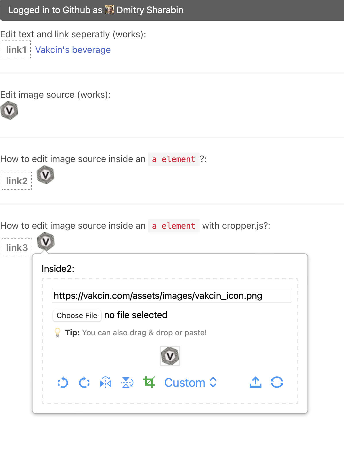 Hi What's the correct way to edit image source, which is also a link? I created this codepen, but I'm not able to popup the image editor (it appears and disappears quickly) Is this related to the bug of editing |
