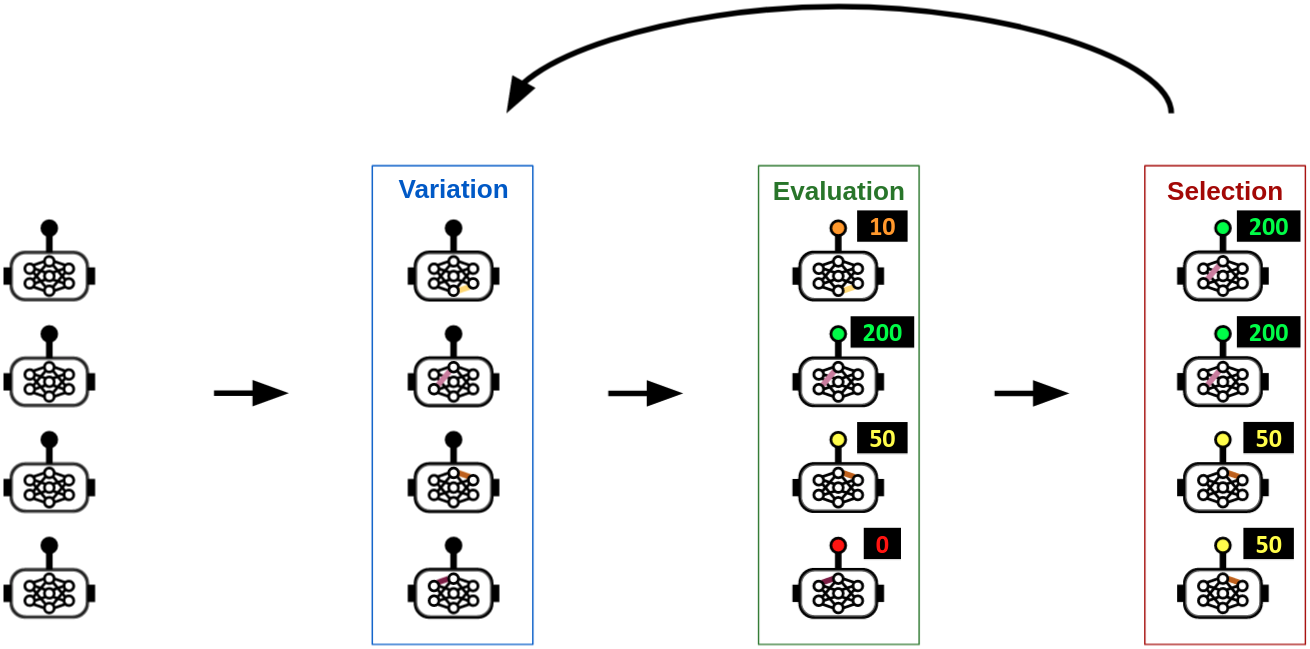 At its core, this library runs a simple Genetic Algorithm wherein fixed-sized populations of artificial agents are iterated upon. Every iteration, during the variation stage, all agents receive random mutations. They are then evaluated on some defined task. Finally the top 50% scoring agents are selected and duplicated over the bottom 50% agents (truncation selection). This process loops onto itself for a chosen amount of iterations.